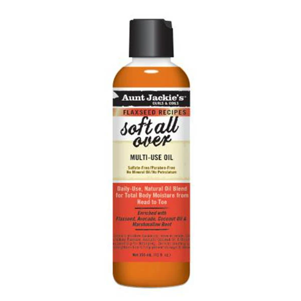 Aunt Jackie’s Multi-Purpose Oil ‘Soft all over’ is a great oil elixir for all over softness and shine. On hair, it is amazing oil therapy that can be used as a hot oil treatment for damage control, daily, as part of a protective styling regimen, or as a finishing step when styling for shine and softness.